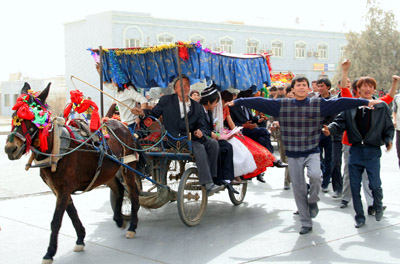 婚礼仪式,婚礼前一天,男方把仪式准备的东西送女方家。一般有活羊、大米、清油、胡萝卜、茶叶、糖果、盐、柴或煤等。彩礼和仪式所需,要视男方家庭条件,要求过高,为舆论不允许,婚礼前,要办理结婚证,婚礼开始,在女方宴请宾客,食毕,由伊麻木或宣礼员(职业宗教者)念“尼卡”(诵经),问新郎、新娘是愿意娶(嫁)对方,答复后,同吃一块浸泡了盐水的馕,意为“我们从此永远在一起,同甘苦,忠贞不渝”接受亲朋好友的祝福。迎亲送亲队伍接新娘走出院门或巷口,邻里们用绳子等物挡住去路,这一习俗表现在新娘的亲善友好,造成欢乐喜庆场面同歌共舞,最后,向众人群中抛撒礼物后驱车上路,至男方家,屋门口置一堆火,新娘越火而入,意为“驱鬼避邪,降临幸福”,由一人掀开婚礼以来一直戴在新娘头上的头巾,新娘起身向众人行礼,同新郎及一干青年男女载歌载舞,至此结婚仪式结束。